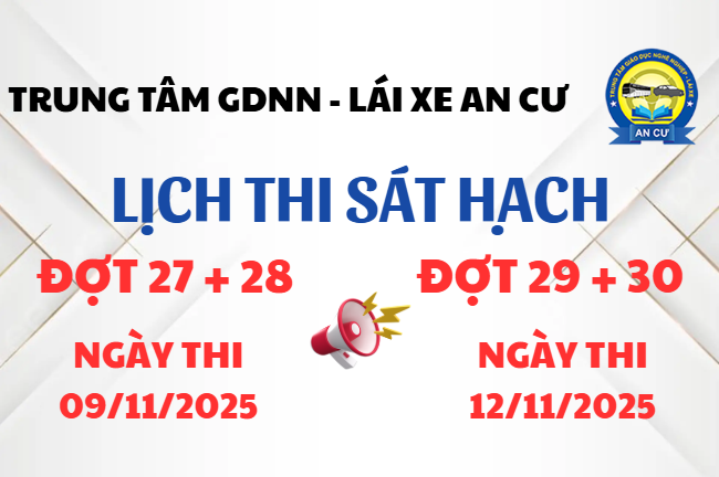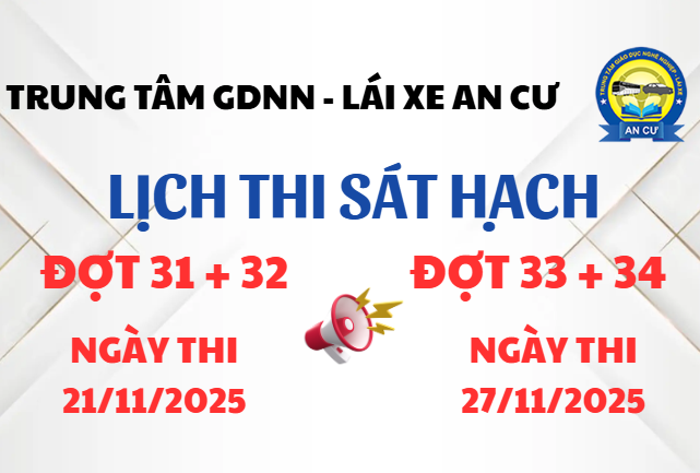 Trung tâm GDNN – Lái xe An Cư trân trọng thông báo: Kỳ thi sát hạch lái xe ô tô – Đợt 31 và 32 sẽ được tổ chức vào ngày 21/11/2025. Kỳ thi sát hạch lái xe ô tô – Đợt 33 và 34 sẽ được tổ chức vào ngày 27/11/2025. Đề nghị các…